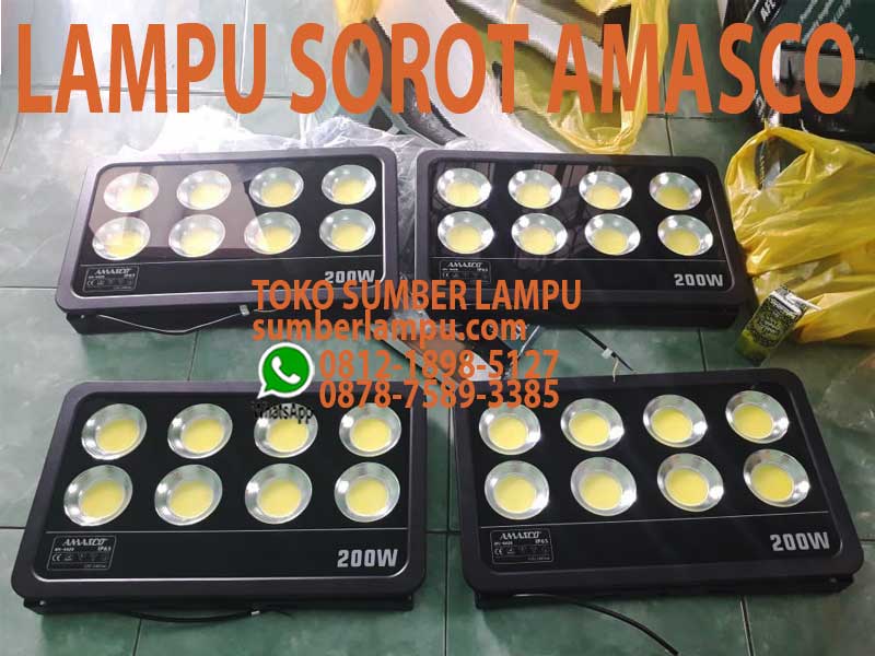 Lampu Sorot merk Amasco 200w COB LED, jenis lampu tembak LED waterproof IP65 chip on board, harga ekonomis, terang stabil & hemat listrik.